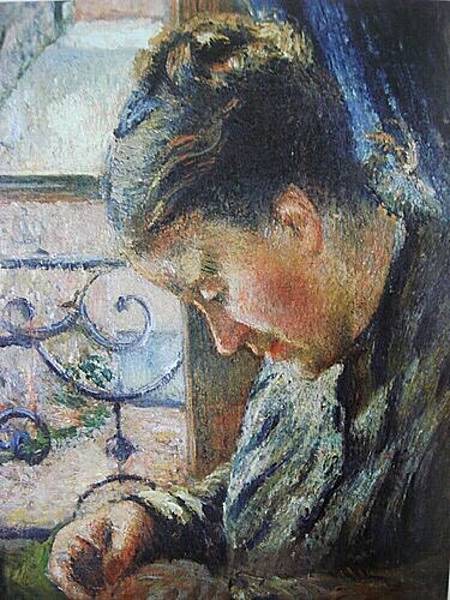 愛家的畢沙羅用大特寫的側面角度,呈現妻子在窗邊專注縫紉的神情,讓人感覺十分溫馨。