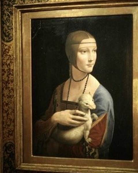 達文西《抱銀貂的女子》(抱白鼠女子)Lady with an Ermine (義大利語:Dama con I’ermellino)1483-1490木板油畫,波蘭·克拉科夫國立博物館(Museum Narodowe w Krakow ),這幅作品是波蘭博物館的鎮館之寶。