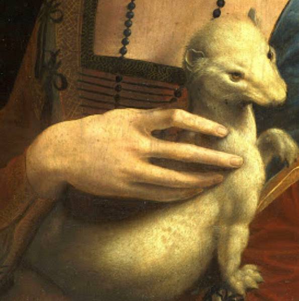 近距離觀察女子懷中的寵物,光潤的白色毛皮和稍嫌兇猛而優雅的三角形口鼻部分,充分反映達文西研究和描繪自然動物的精湛技藝。另外值得一提的是,達文西文稿中曾經寫過白鼠常常會被餓死,因為他們寧願被獵人抓獲也不願躲在骯髒的洞穴裡,以免玷污了自己的純潔。在達文西手稿中,隨處可見他所畫的動物,他探索觀察動物的每個動作和每個細節,所以他能描繪出唯妙唯肖的貂、昆蟲和其他動物,逼真程度令人驚嘆不已。