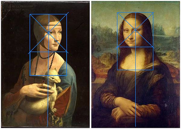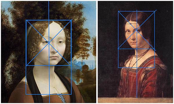 「繪畫中的黃金比例」- 希臘的數學、哲學家畢達哥拉斯Pythagoras 認為數學和藝術是緊密相連的,一件藝術品的成功,一定要講究各個部分之間對稱與和諧的比例,自然就蘊藏著豐富的美學價值。在達文西的諸多作品中,人體各部分也都滿足了黃金比例,譬如這幾幅女性肖像畫臉部的周圍,可以勾勒出所謂的「黃金矩形」,將幾何學與藝術完美交融在一起,我們的審美品味也會隨之提升。
