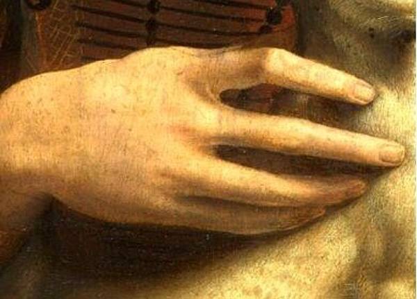 好友鈴櫻說:她最佩服的是達文西在女子手使力上的輕重描繪。抱一隻動物、寵愛它時手是會施力的。施力到讓動物有感。但很舒適、所以動物除了它的支撐腳 - 右腳用了力。左腳是放鬆的。她說,一幅好畫、是動態的且在細微處是能和觀者對談的。