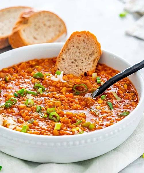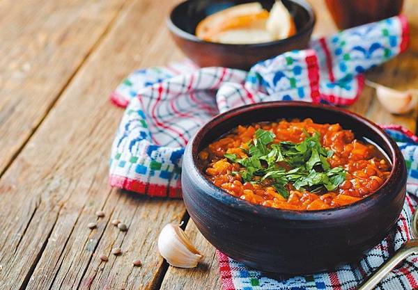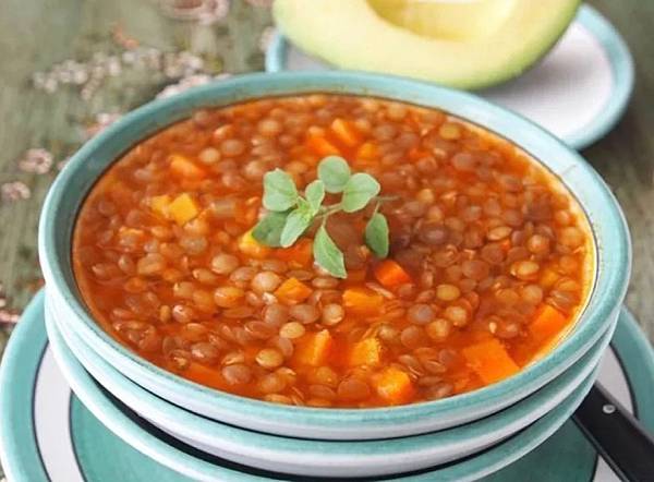 材料:水1升、小扁豆200克、橄欖油3湯匙、青椒1個、洋蔥1個、番茄500克、鹽適量、新鮮黑胡椒粉適量。