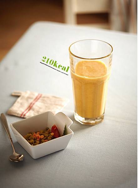 作法 :1. 將小扁豆放入滾水中烹煮約10分鐘左右 2. 將煮熟的小扁豆、香蕉、低脂牛奶和清水倒入食物調理機當中充分攪打均勻。