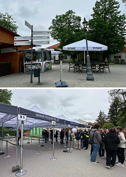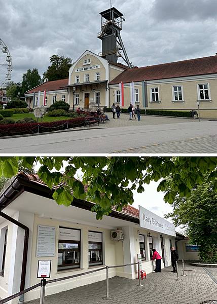上午8:40抵達現場,等候領隊購票進入。 眼前這座建築是鹽礦的入口及訪客中心,上方有個高大金屬結構的礦井架,代表該區曾有的挖礦活動。