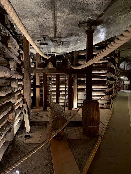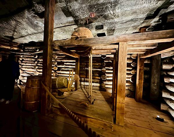 昏暗的燈光下,整齊堆放的木材,這是支撐礦井結構的木樁;木製的支架,圓形的滑輪,用來提升和降下鹽塊或礦物的機械裝置。