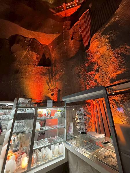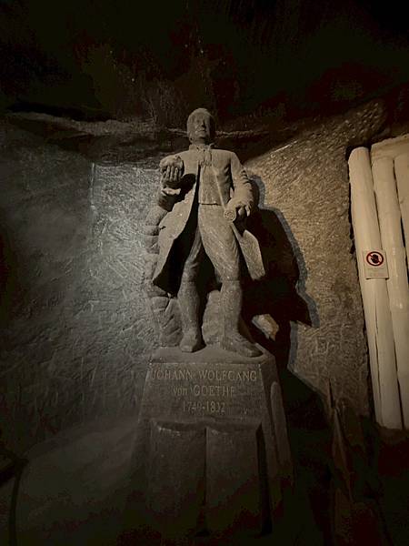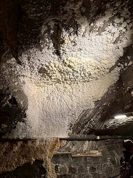 整個天花板牆面滿是鹽礦殘留的結晶。沿途會有一些蠟像,可以看見幾百年前礦工們的衣著和工作情況。