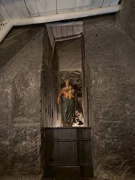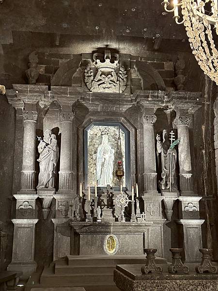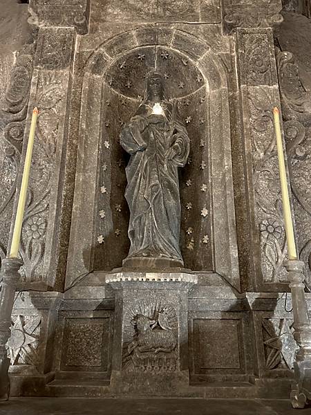 在天主教信仰中,聖母瑪利亞是耶穌的母親,深受尊敬。在聖金加禮拜堂 (St. Kinga's Chapel) 或鹽礦內的其他祈禱場所,聖母瑪利亞的形象是常見的。雕像兩側有高高的蠟燭,下方基座上的雕刻,看起來像是羔羊,通常象徵耶穌基督 (「上帝的羔羊」)。