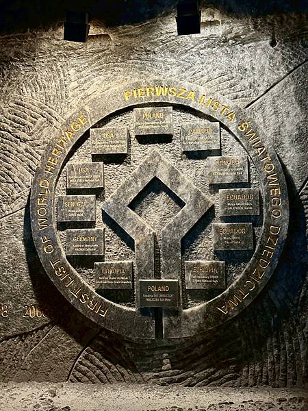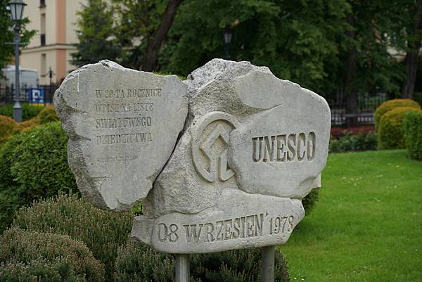 紀念維利奇卡鹽礦列入 UNESCO (聯合國教科文組織) 世界遺產名錄 20 週年的紀念碑 (右側的 "UNESCO" 是聯合國教科文組織的標誌。碑上刻著1978年9月8日被列入世界遺產名錄的。)