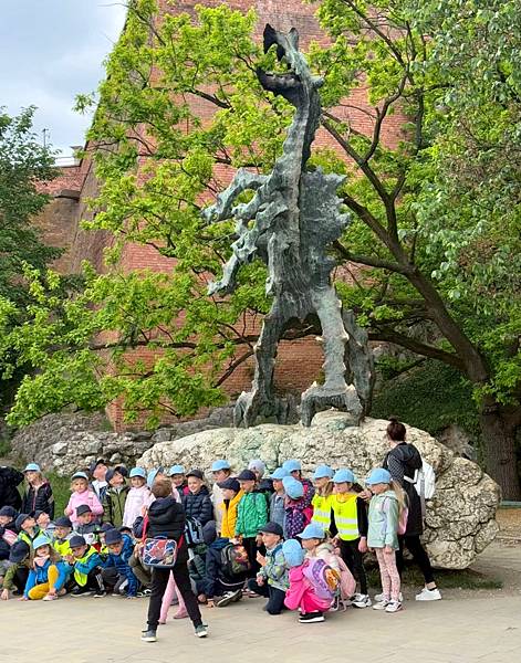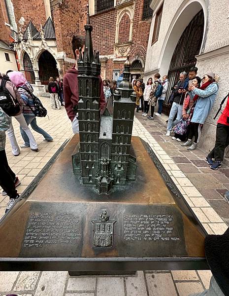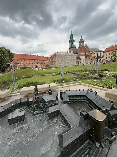 領隊馬丁及當地導遊講解克拉科夫的瓦維爾山 (Wawel Hill) 及其周圍建築銅製模型上的繁複細節。這個地方自1090年以來一直是波蘭統治者的居住地和重要的政治文化中心。