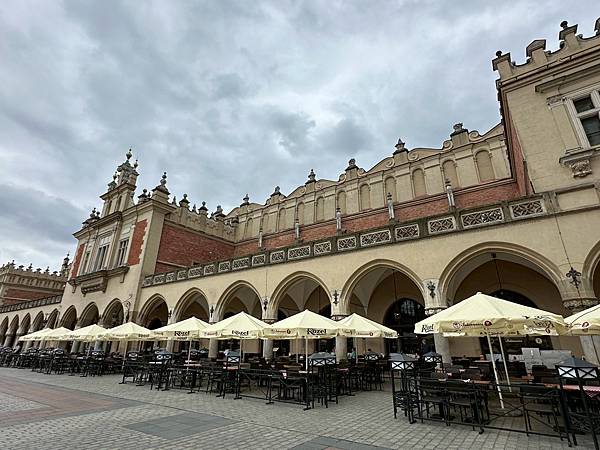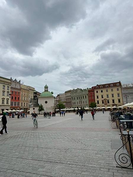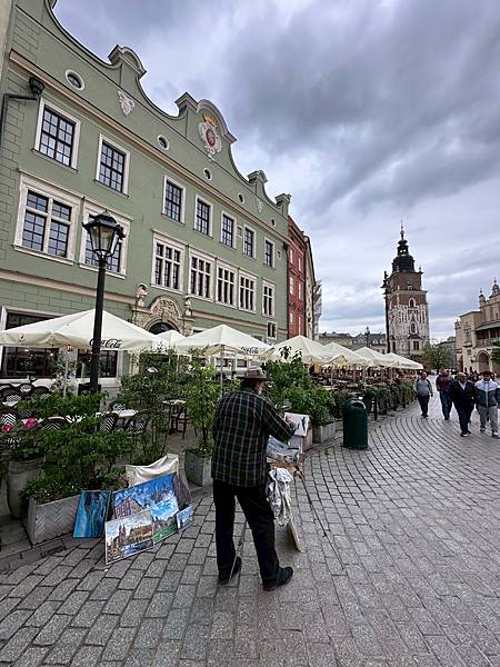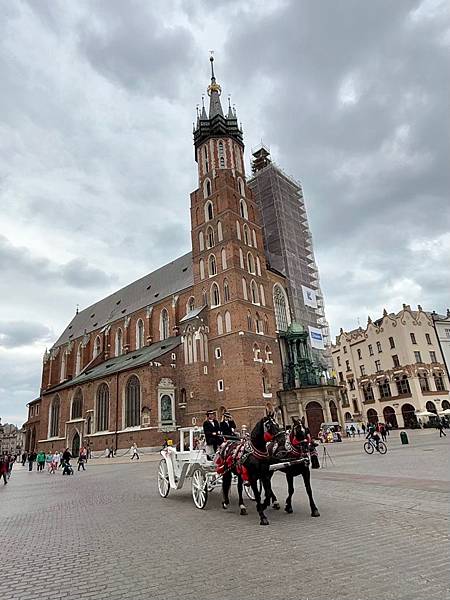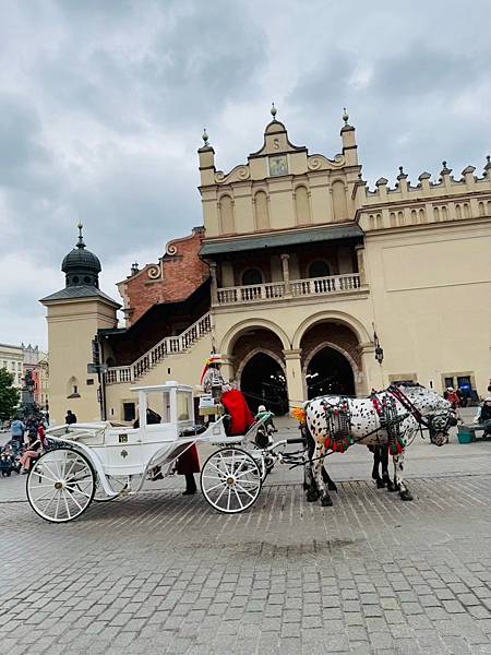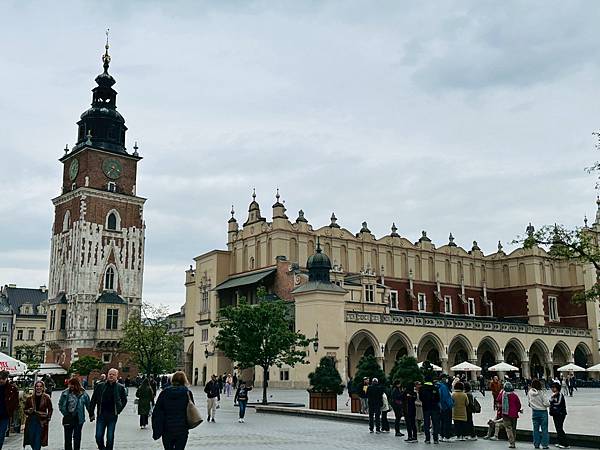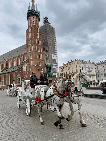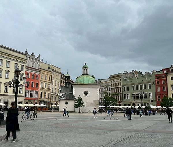 聖母聖殿、紡織會館、市政廳鐘樓、聖亞德伯堂,是中央市集廣場最標誌的建築。熙熙攘攘的人群,漂亮華麗的馬車沿著廣場前行;街邊餐廳露天餐位,坐著許多食客,一面品嚐美食,一面欣賞老城風景。整個克拉科夫最熱鬧的地方,大概就在這裡了。