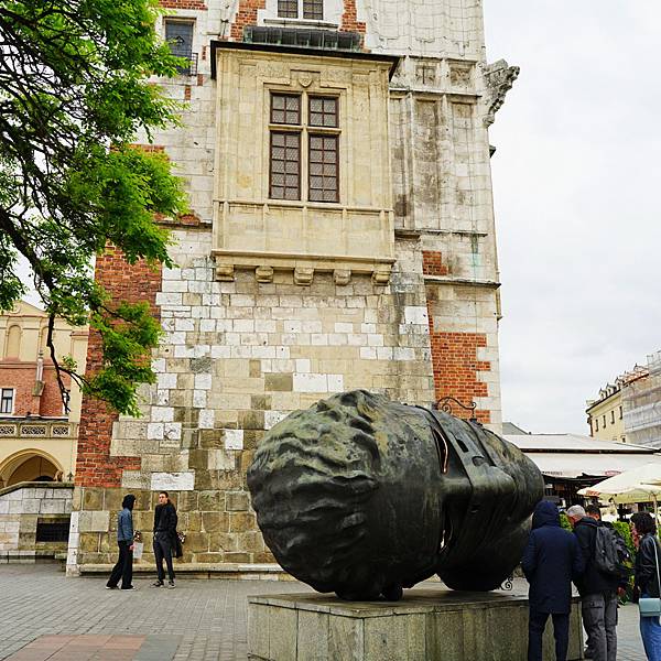 在市政廳鐘樓旁則有一個相當顯眼的雕像 - “Eros Bendato”,這是波蘭知名藝術家 Igor Mitoraj 的作品。他擅長利用人體部位做為創作,其中更有許多作品展示於世界各主要大城市之中。
