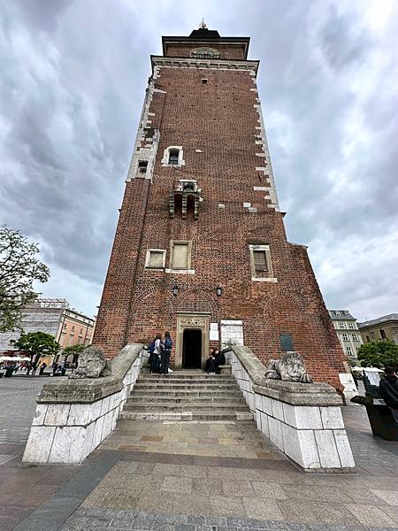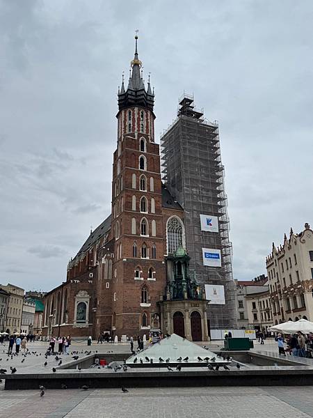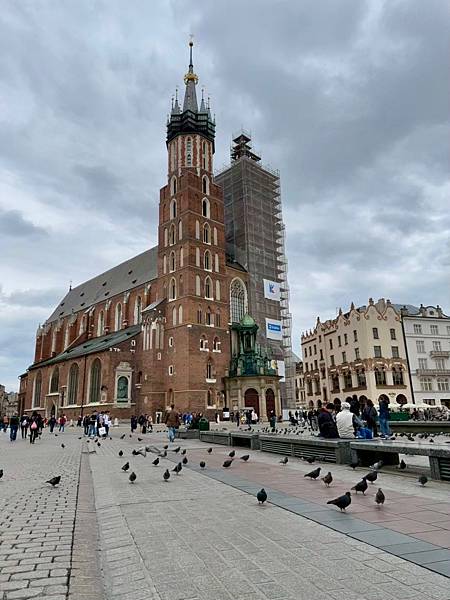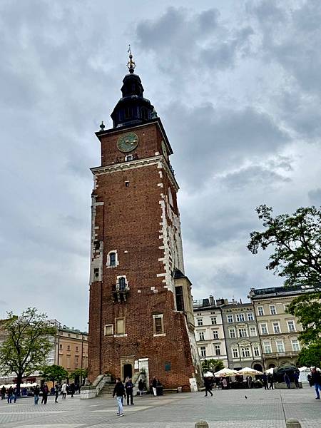 一旁有市政廳鐘樓,東南角則為11世紀所建的聖亞德伯堂 (Church of St. Adalbert),配上聖母聖殿,整體構成了經典的克拉科夫美景。