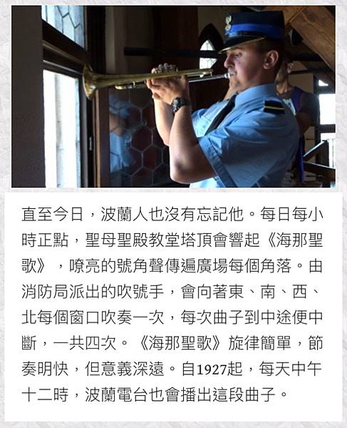 原來整點的號角聲,是為了紀念一位在中古時期蒙古人入侵,教堂頂上吹號發出警報而被弓箭射穿喉嚨的號手。