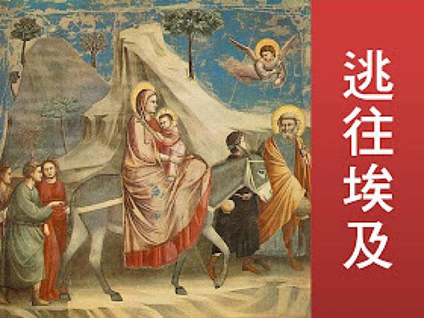 三、「逃往埃及」為了躲避希律王的殺戮,約瑟和馬利亞帶着嬰孩耶穌逃亡到埃及。