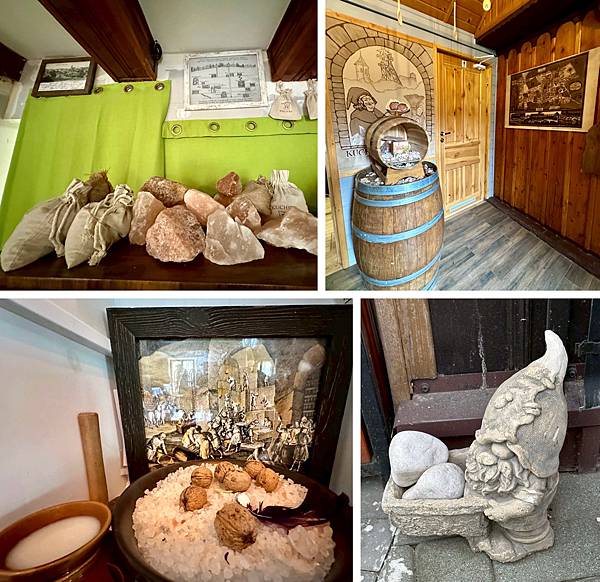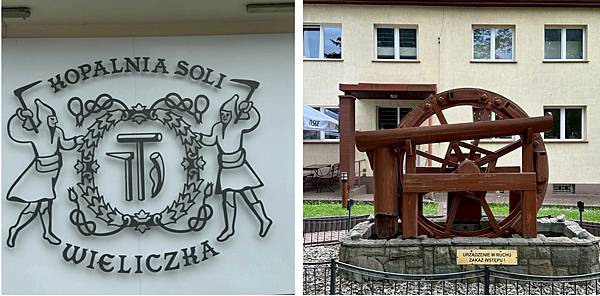 鹽礦花園區前方的展示:下左圖:維利奇卡鹽礦的標誌 ;右:一個古老鹽礦木製結構的裝置模型 (模擬早期鹽礦中用來抽水或提鹽的馬力驅動機械或水車裝置)。