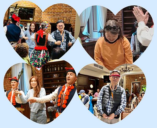 波蘭舞者表演告一段落,下來邀請團隊成員ㄧ起共舞共樂。領隊馬丁說,他們的表演是無酬的,最後特別買了舞者販售的珊瑚紅項鍊捧場贊助他們。