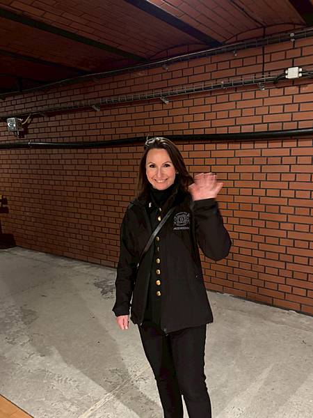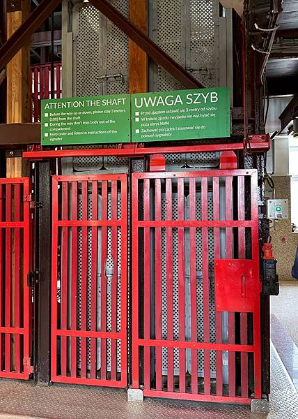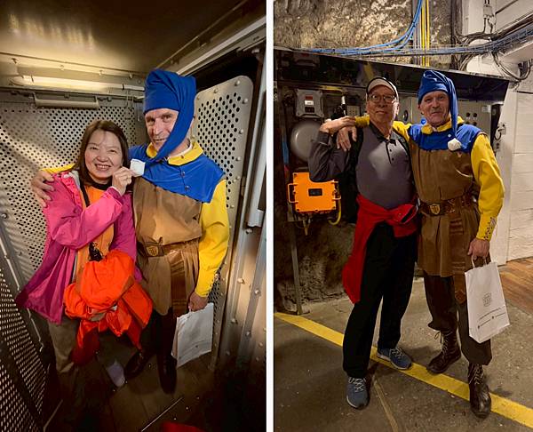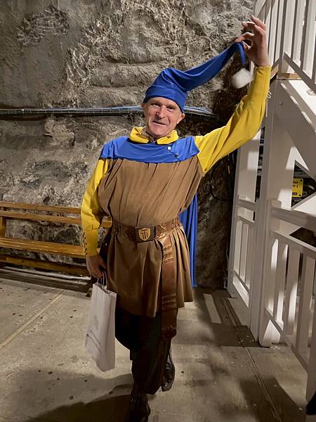 維利奇卡鹽礦電梯的搭乘,工作人員先透過電話上下聯繫,再將遊客分批送上去,電梯ㄧ次可供九個人。最後一梯次,只有三個人:中世紀宮廷娛樂小丑裝扮的是鹽礦兒童導覽老師,褐色搭配黃、藍鮮明色的束腰外衣,他分別和于晴闆娘及我老公拍了充滿趣味性紀念的照片。