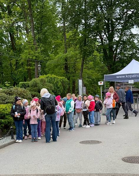 ㄧ群小學生跟隨老師也排隊進行參觀鹽礦的活動。